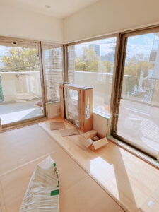 3面バルコニーとなりますが、今回、奥行きのあるバルコニー部分に白いタイルを施工し、外カフェスタイルのステージングを試したいと思います。