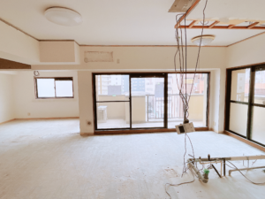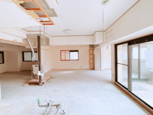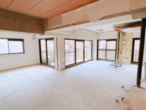 既存の間取りの大幅変更にともない、内装を全て解体し、イチから作っていくスケルトンリノベーションとなります。